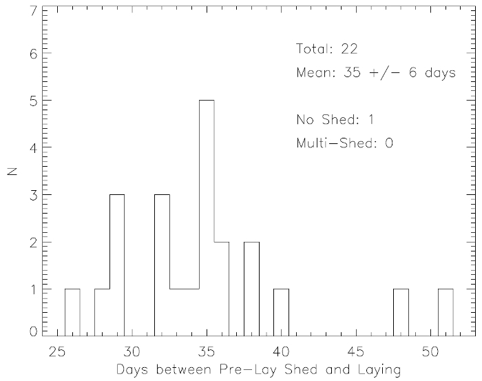 The following is a histogram of the time between a snake's pre-lay shed and lay date, including data